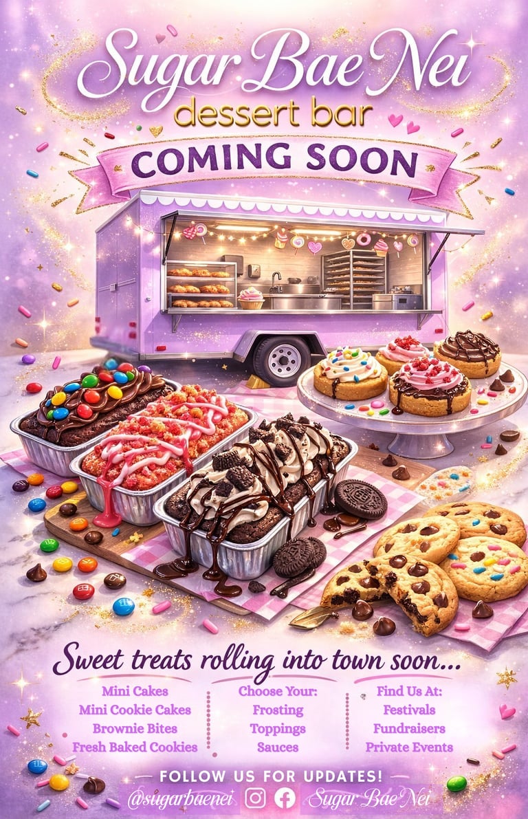 The Sugar Bae Nei Dessert Bar — our mobile dessert trailer — is expected to debut in April 2026! This new addition allows us to bring the sweetness of Sugar Bae Nei directly into the community in a fun and memorable way.